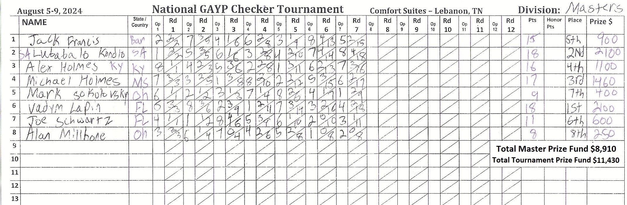 We have 8 Masters and 9 Others: (Majors, Minors, & Youth). In our business meeting we decided to play a Round-Robin, 4 day tournament. The Master are required to record their games and play by clock set 45 minutes + 5 second. Each day play starts at 9:00 AM for the first game and the 2nd game starts at 2:00 PM. Masters play 2 games each day and 1 game Thursday, while the Other Class plays 2 games each day, and your opponent's clock is started at that time if late. Prize Fund looks to be $11,430 with 1st place Master $4,200.