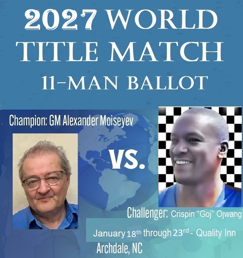 earned the right to challenge GM Alex Moiseyev for this title match by winning the 2025 USA Nationals - 11-Man Ballot WQT in Vidor, Texas. “Goj” age 44, has an edge on 66 year old GM Moiseyev, hopefully Alex's 11-Man experience will prevail popular odds.We negotiated